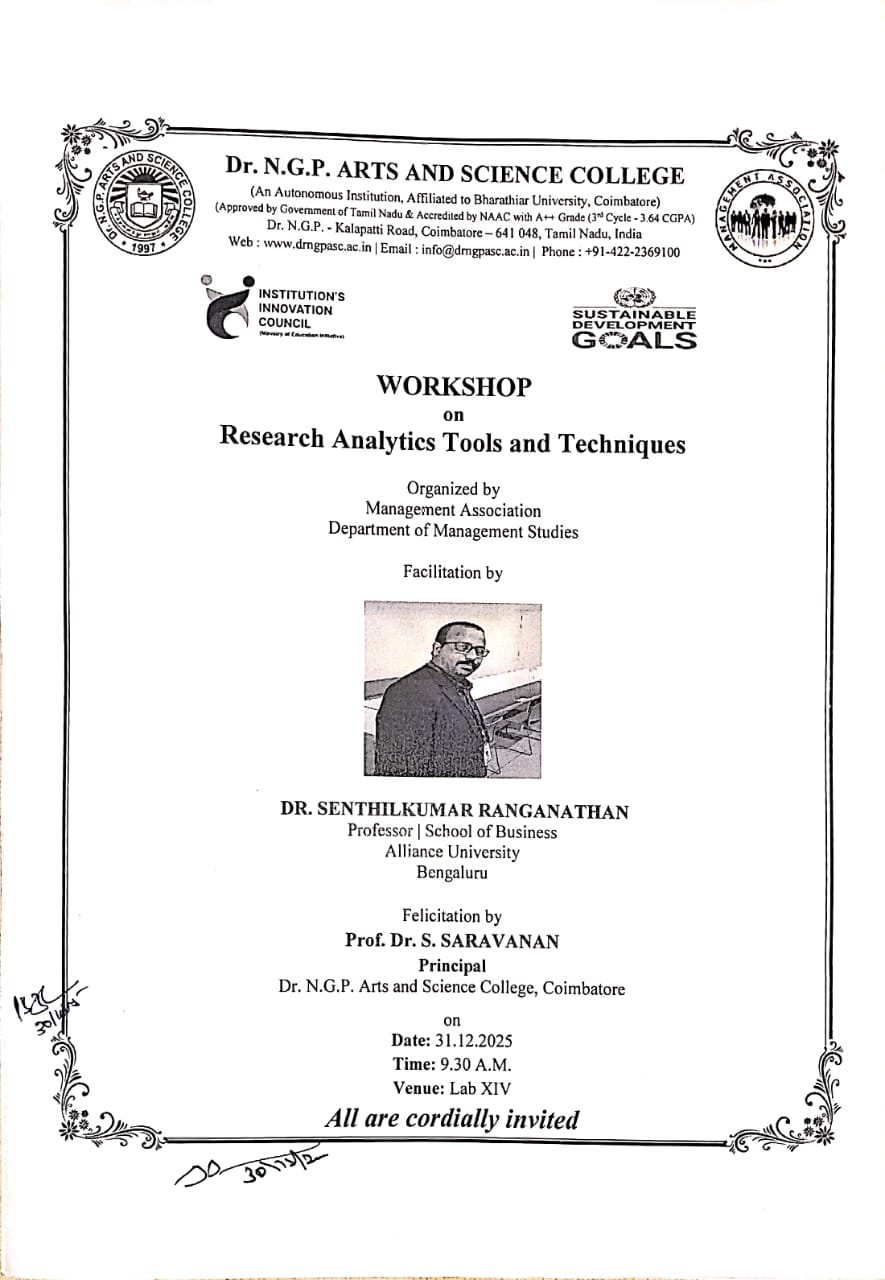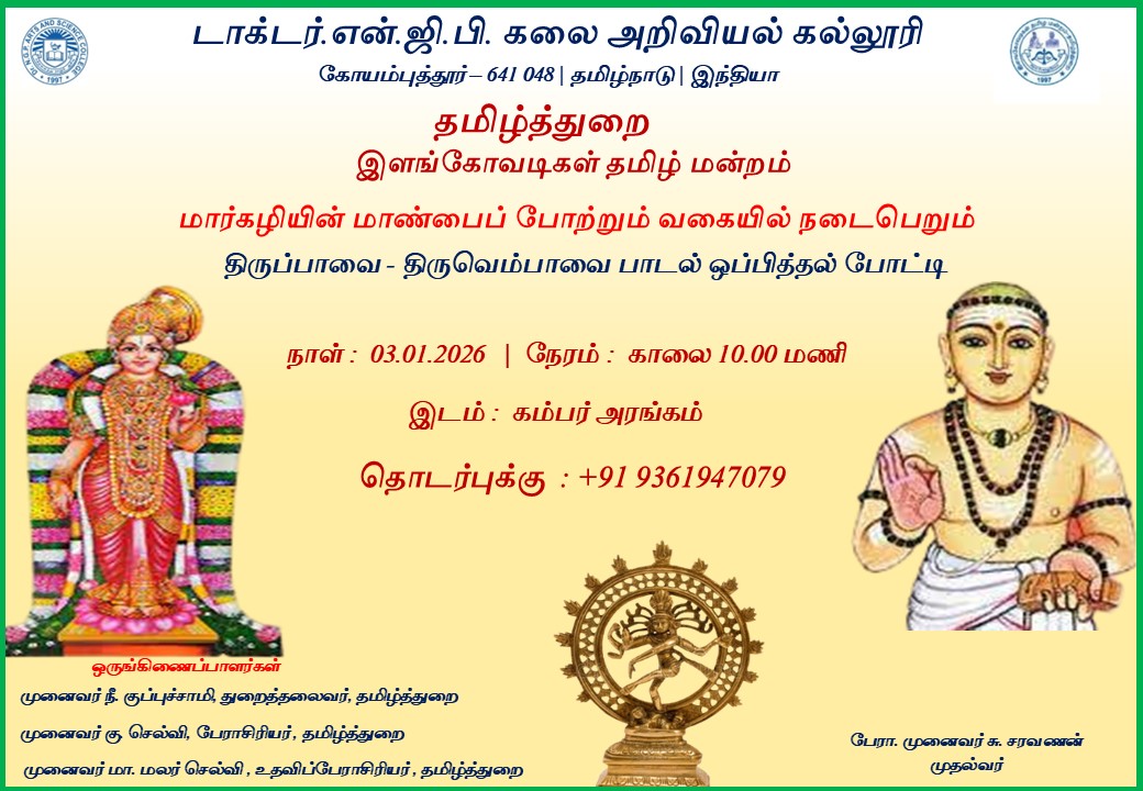 Dr.N.G.P Arts and Science College was established by the Dr NGP Research and Educational Trust (Formerly Kovai Medical Center Research and Educational Trust) Coimbatore in 1997. The college incepted its educational journey with 4 Under Graduate Programmes and today it is emerged as one of the major academies in self-financing institutions in Tamil Nadu, India. The college conferred with the autonomous status in 2015-2016 by the UGC and is affiliated to Bharathiar University, Coimbatore. The College was accredited by the NAAC with ‘A++’ Grade in the Third cycle and ranked no. 66 by NIRF.